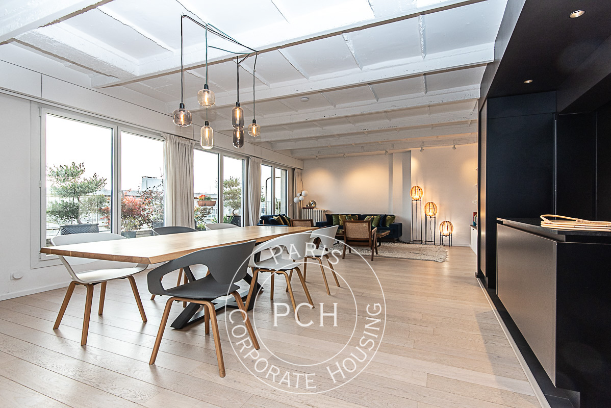 • Un jardin d’hiver, meublé, disposant d’une cuisine équipée indépendante, offrant un accès direct à un toit-terrasse de 106m².
