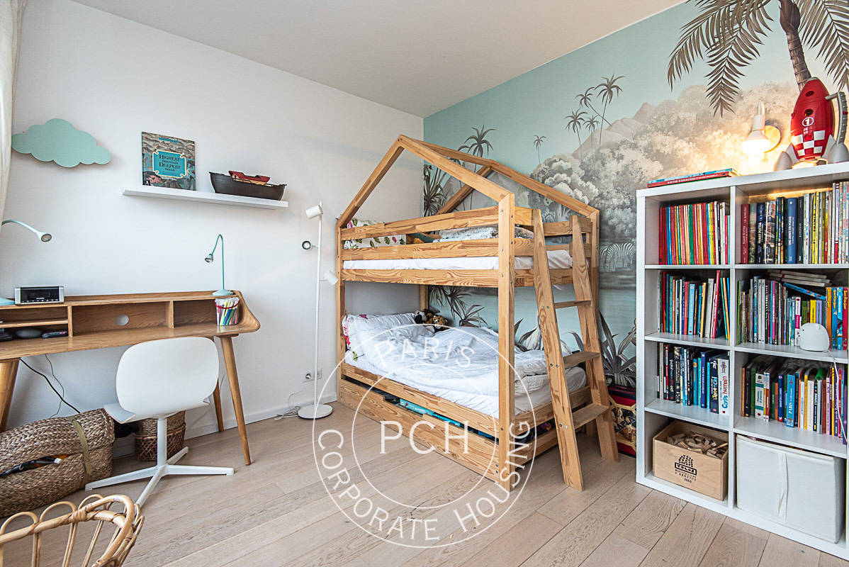 • 3 chambres donnant toutes sur le hameau d’Auteuil et ses jardins (vue sur la Tour Eiffel), disposée de la manière suivante :