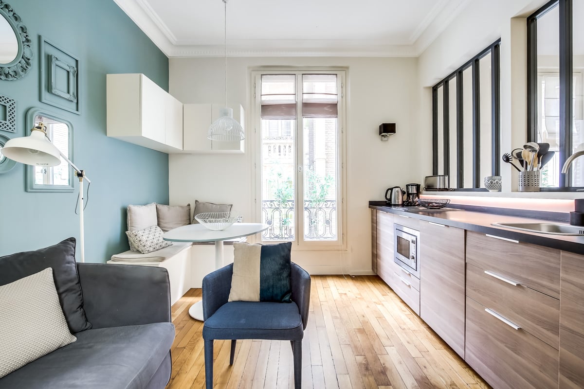- A living room, opening on a fully-equipped open-plan kitchen. High-end appliances.