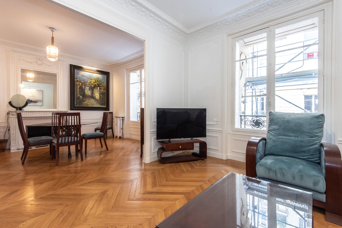 In a Haussmann building. Hardwood flooring, moldings, decorative fireplace.