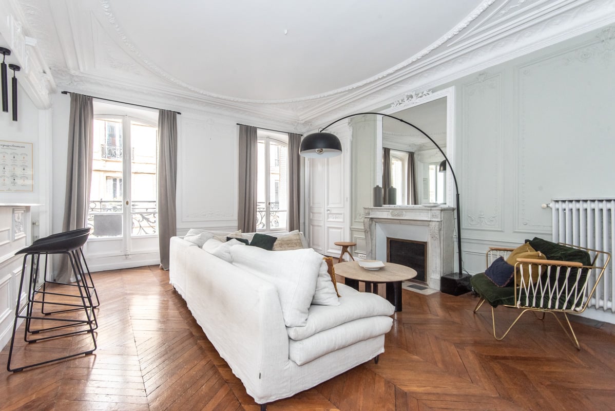 In a Haussmann building, with common areas in good conditions. Upscale furniture, refined, elegant decoration. Hardwood flooring, moldings, decorative fireplace. High ceilings.