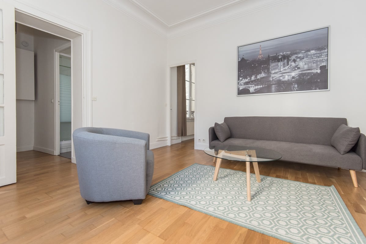 Furnished apartment located on villa Michel Ange in Paris 16th arrondissement close to place Jean Lorrain, metro stations Michel-Ange - Auteuil (line 9 and line 10) and Église d'Auteuil (line 10). With common areas in excellent conditions. The apartment was recently renovated. Upscale furniture, refined, contemporary, elegant decoration. Hardwood flooring.