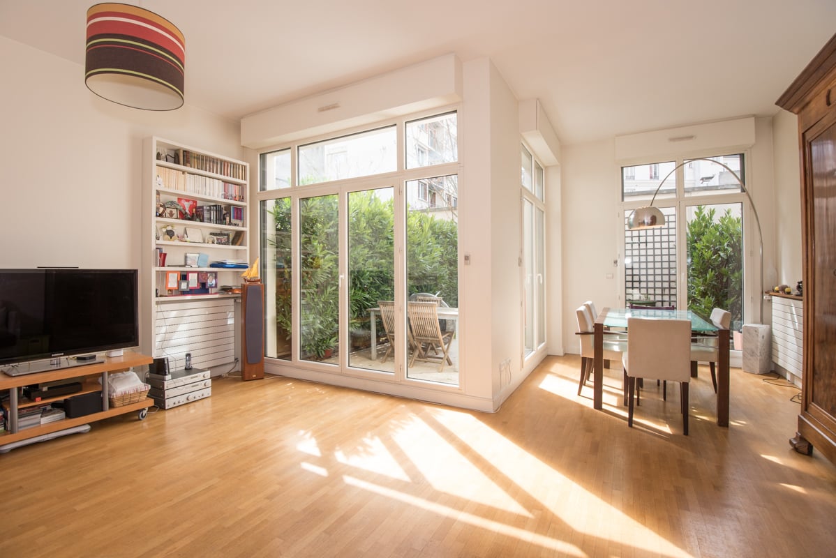 Ground floor: living room (South West exposure) with large bay windows opening on a private terrace and small garden. Fully equipped kitchen. Guest WC.