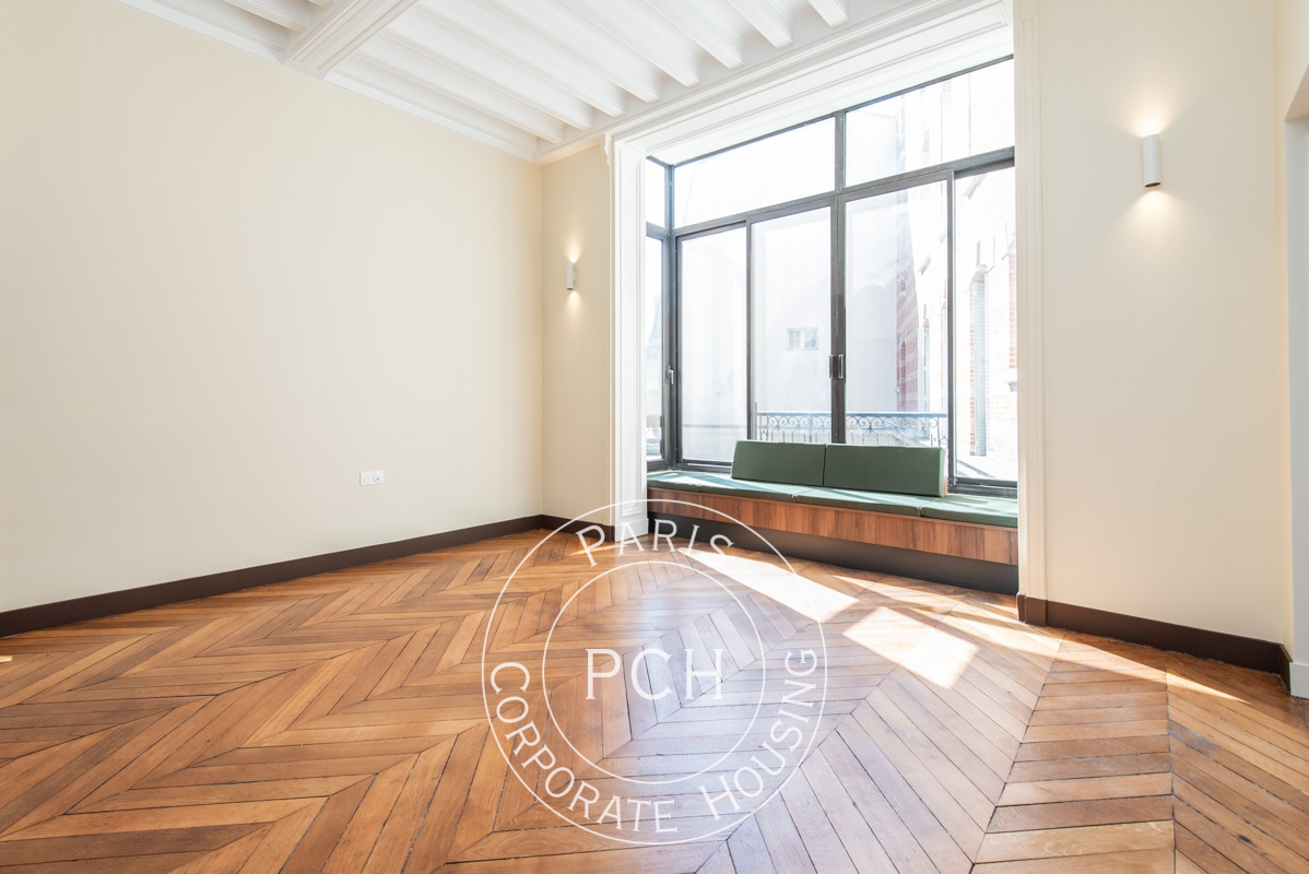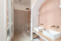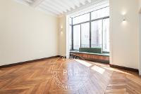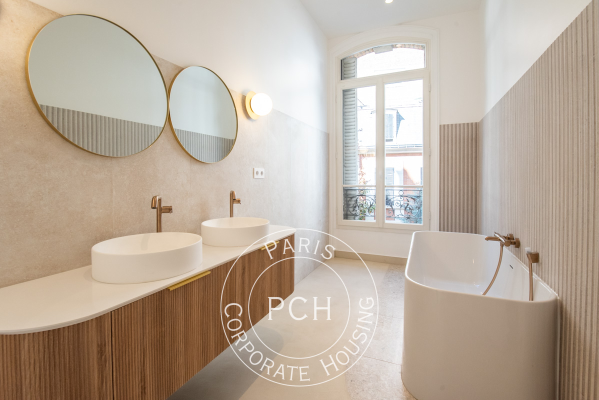 - A beautiful en-suite bedroom with a dressing room and shower room (shower/WC), very bright thanks to a large glass partition overlooking the building's landscaped courtyard.