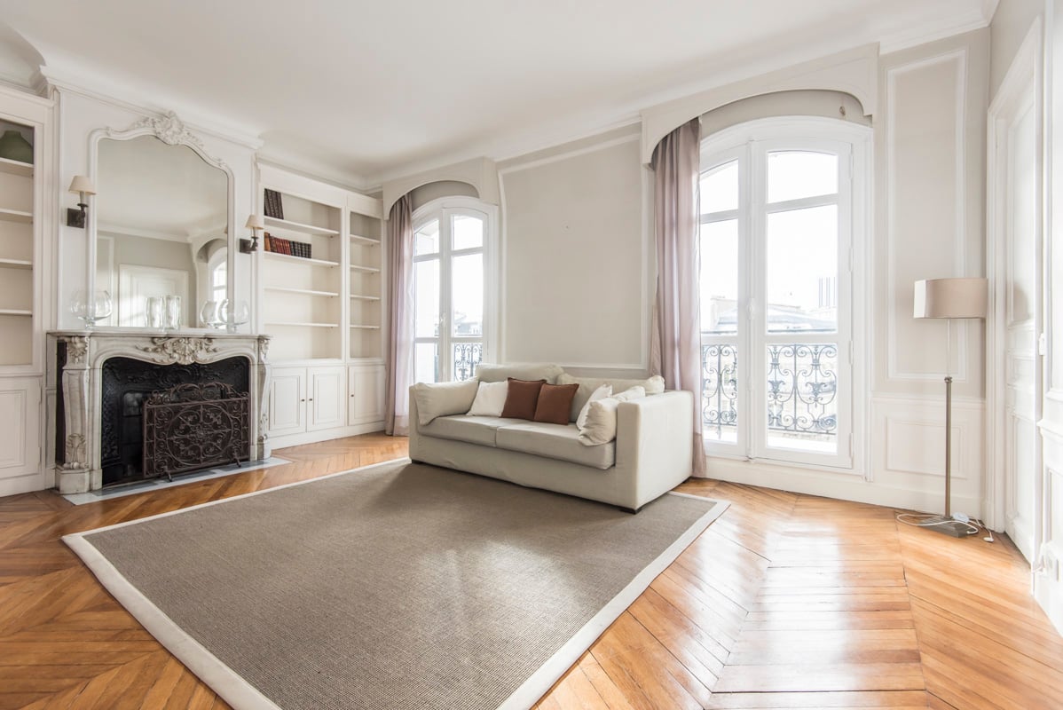 In a Haussmann building, with luxury common areas, on the 6th French floor with elevator. Upscale furniture, refined, contemporary, elegant decoration. Hardwood flooring, moldings, decorative fireplace.