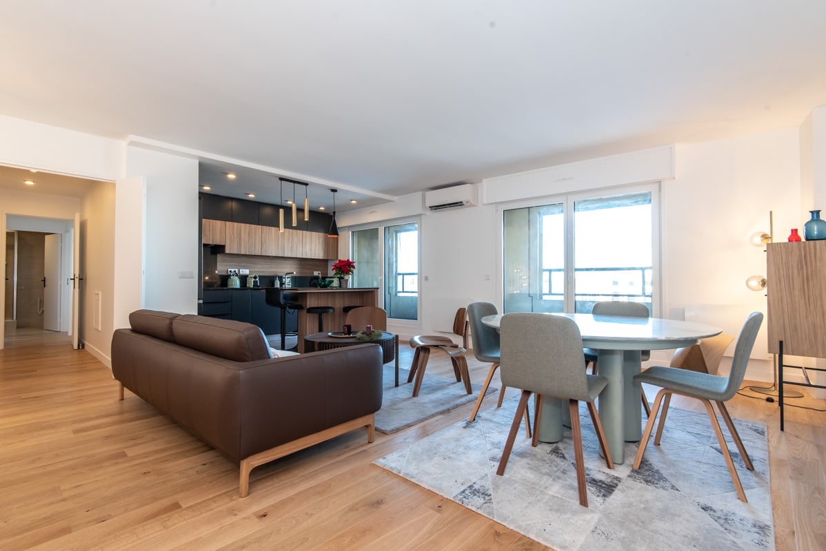 - A living/dining room with large bay windows and a west-facing continuous balcony. Exceptional view on the Eiffel Tower"
