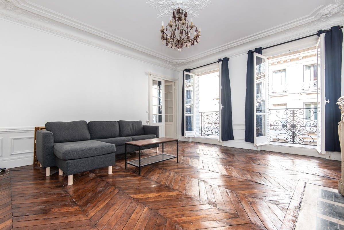 - A very bright living room with access to a balcony. Beautiful high ceilings, large French doors.