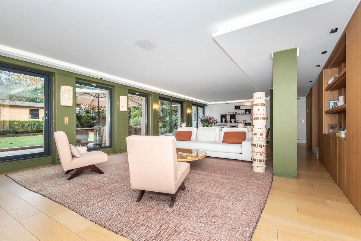 - A superb living room with solid parquet flooring, large bay windows overlooking the terrace and the garden. Not overlooked. Quiet. Integrated audio system.