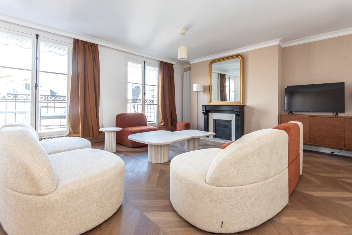 In a Haussmann building, with common areas in good conditions. Upscale furniture, refined, elegant decoration. Hardwood flooring, moldings, decorative fireplace.