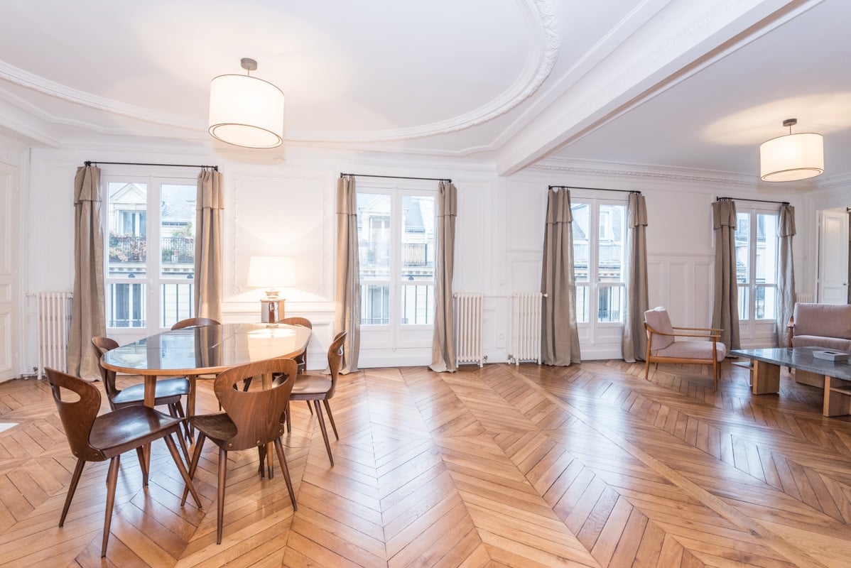 - A spacious double living room, with a balcony all along, facing West. Double glazing, very quiet. Hardwoods, mouldings, fireplace. High-end furniture, sober and elegant.