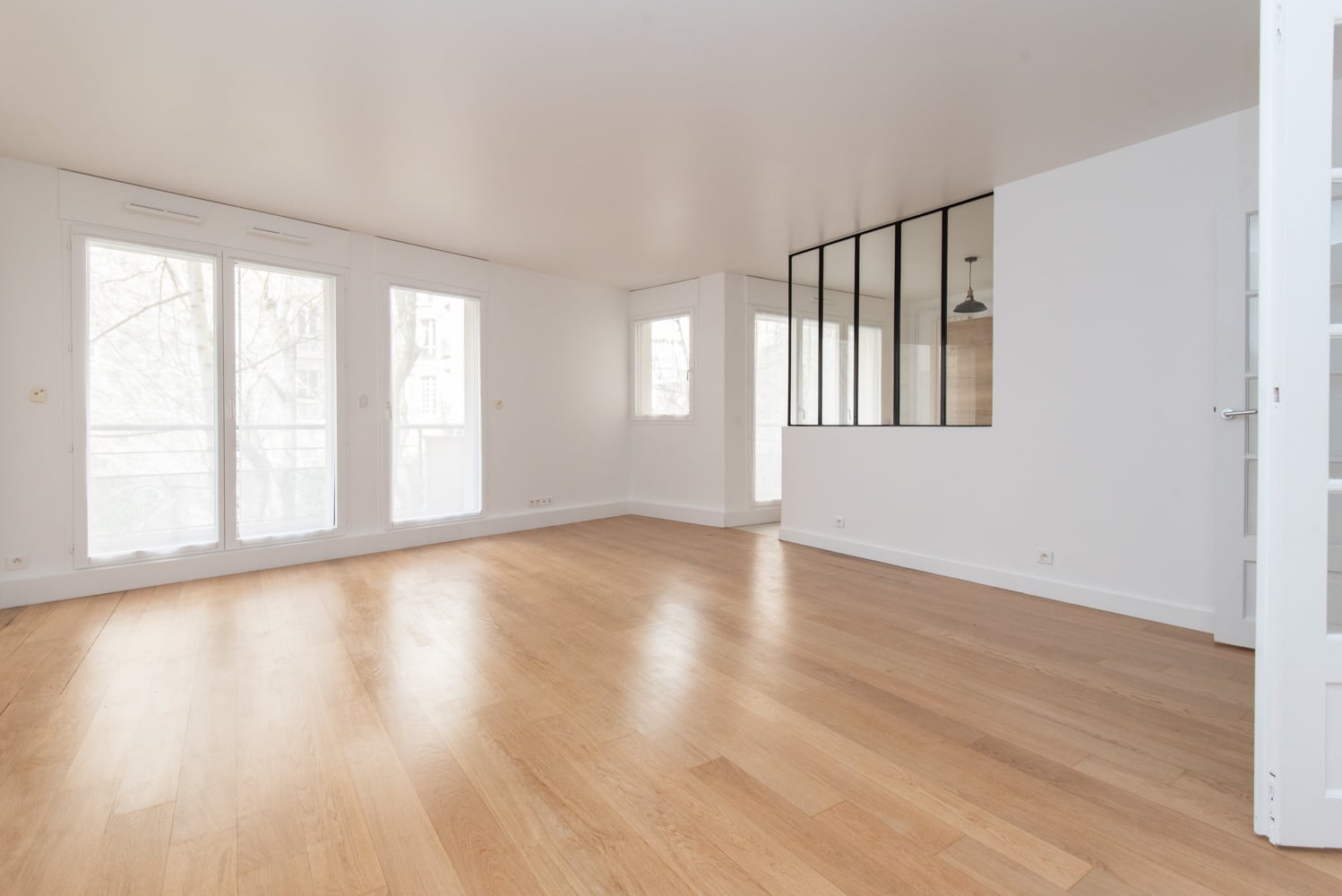 - A living room with a large bay window, opening on a balcony and a tree-lined courtyard. Large kitchen opening on the living room (with a glass panel), fully equipped, refurbished, impeccable.