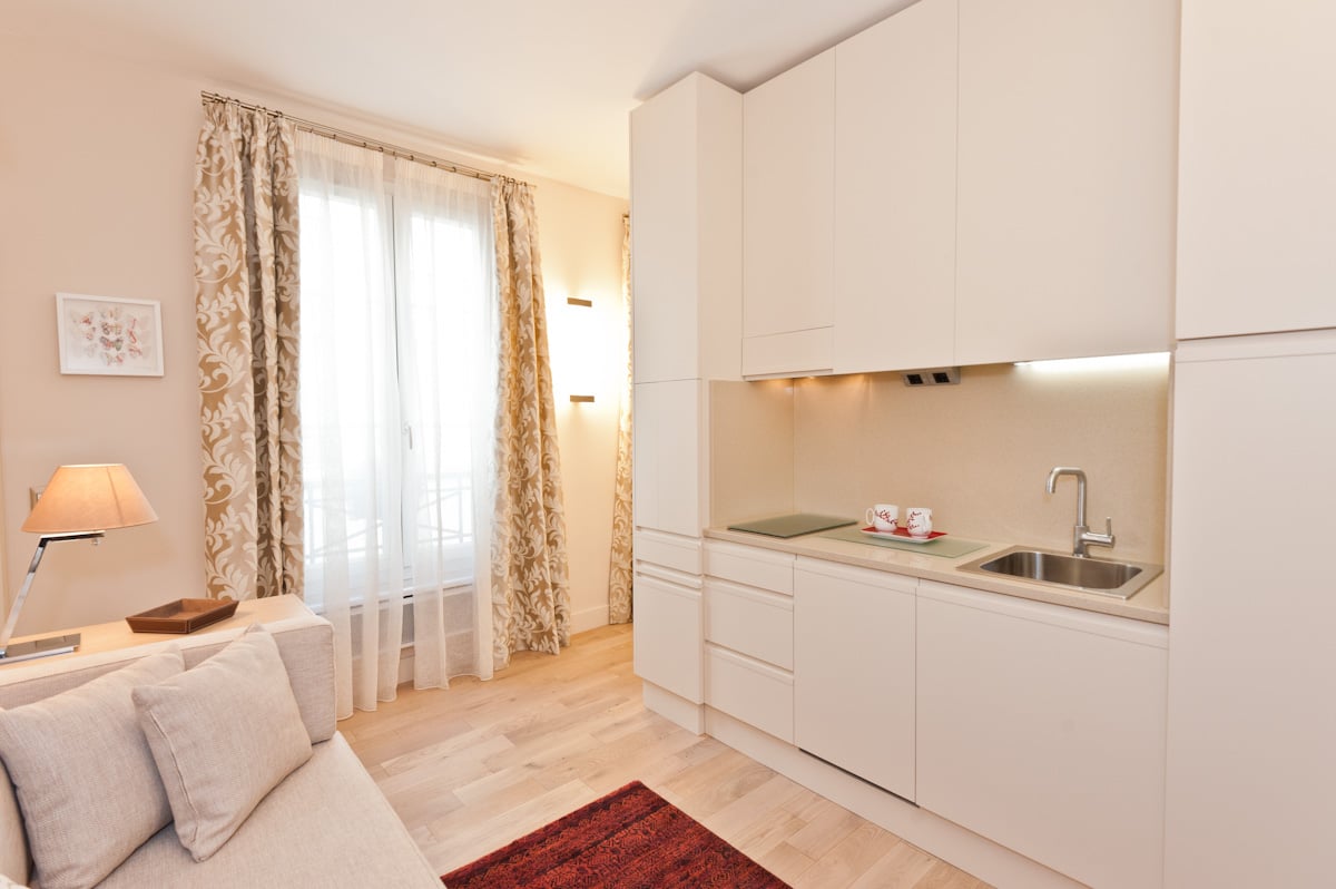 This 30 sqm (~310 sq ft) furnished apartment is located in a pleasant area in Paris 9th arrondissement, in front of square Montholon. 4th floor with an elevator. Close to metro stations (line 7 and 9).