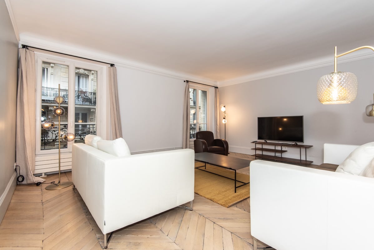 Furnished apartment located on rue Pierre Sémard in Paris 9th arrondissement close to metro station Cadet (line 7). Contemporary decoration. Hardwood flooring.