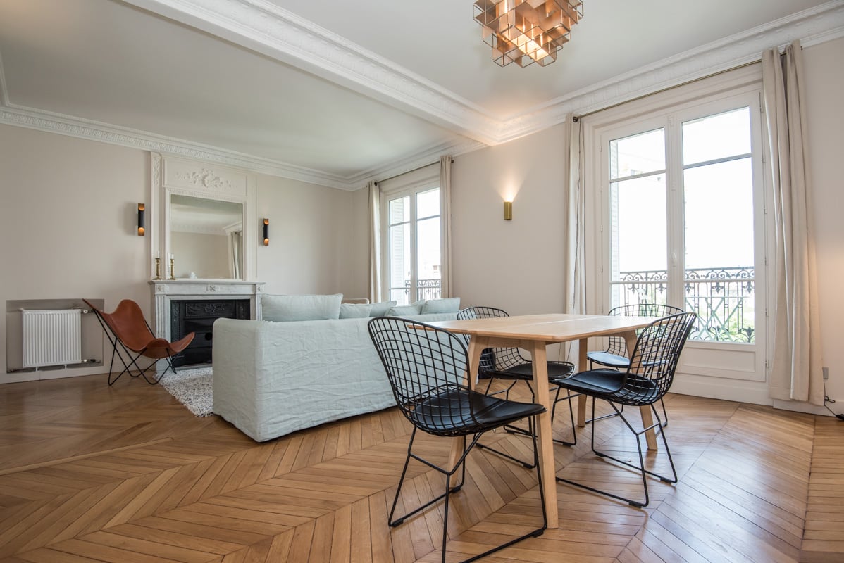 In a Haussmann building, with common areas in excellent conditions. The apartment was recently renovated. Upscale furniture, refined, contemporary, elegant decoration. Hardwood flooring, moldings, decorative fireplace. High ceilings.