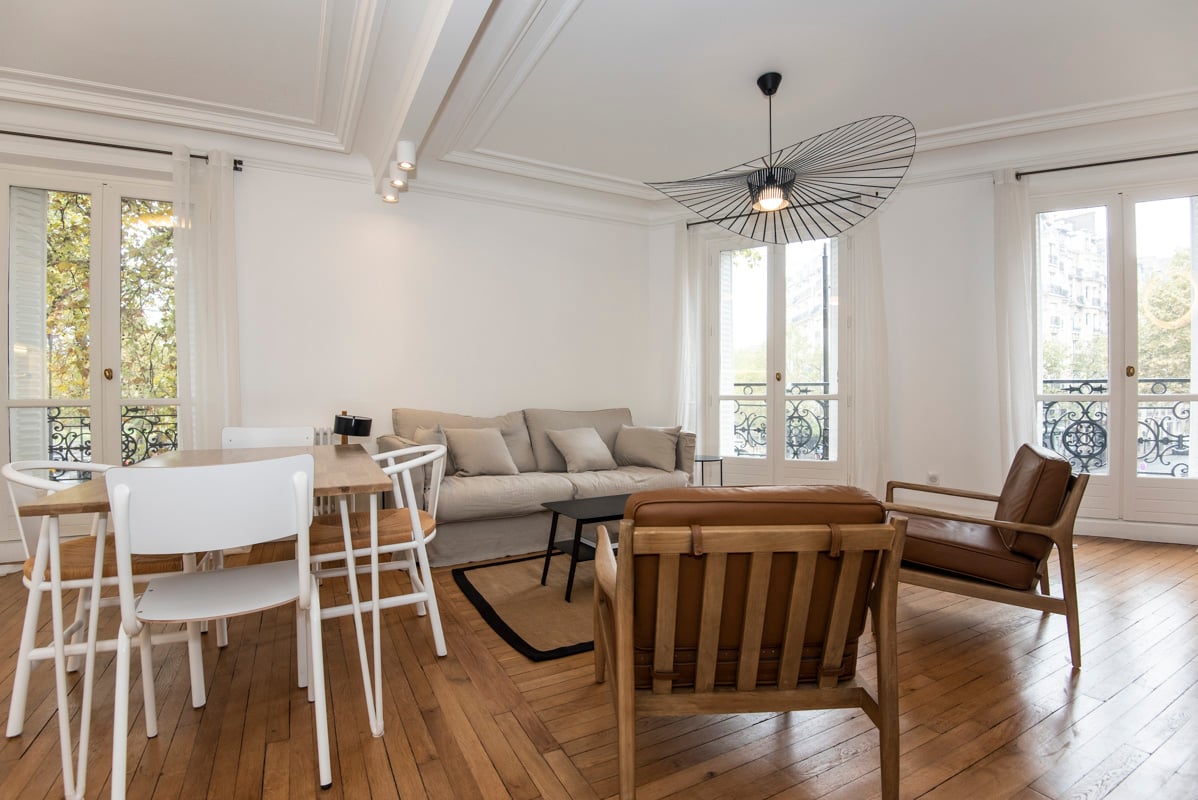 In a Haussmann building. Upscale furniture, refined, contemporary decoration. Hardwood flooring, decorative fireplace. High ceilings.