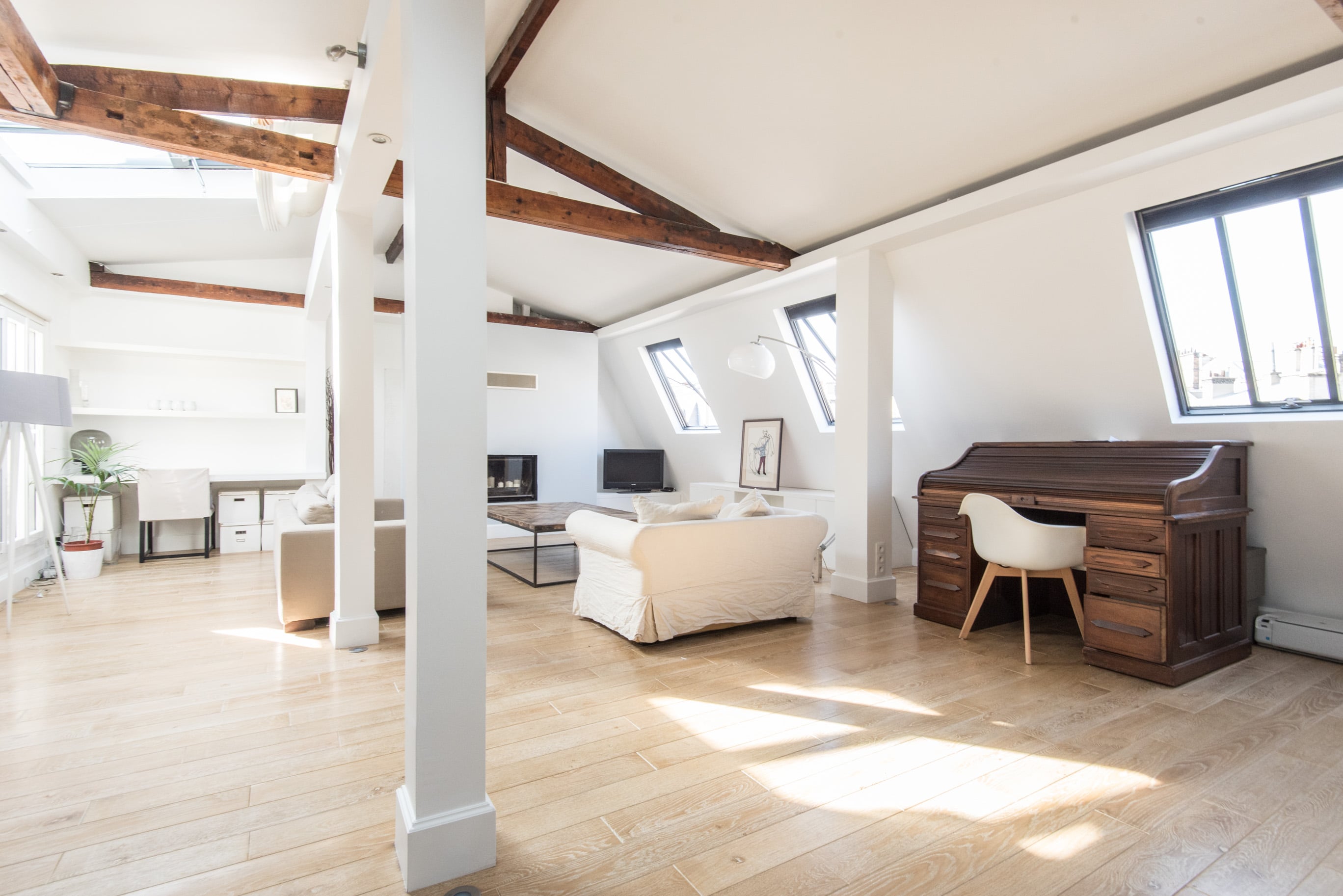 - 1 grand séjour, très contemporain, avec nombreux Velux (muraux et zénithaux) + fenêtre sur cour, vue Tour Eiffel.