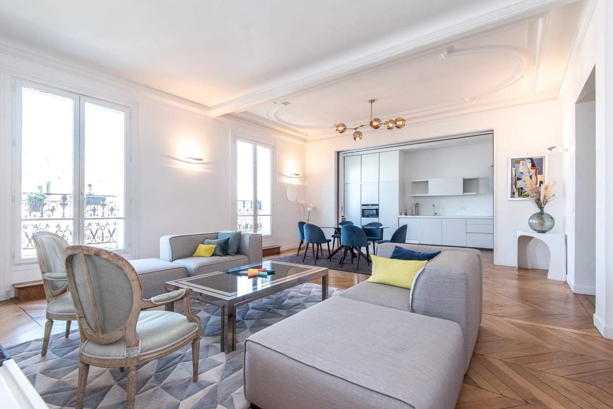 - Un spacieux et très lumineux séjour ouvrant sur un long balcon filant avec une vue incroyable sur l'Arc de Triomphe.