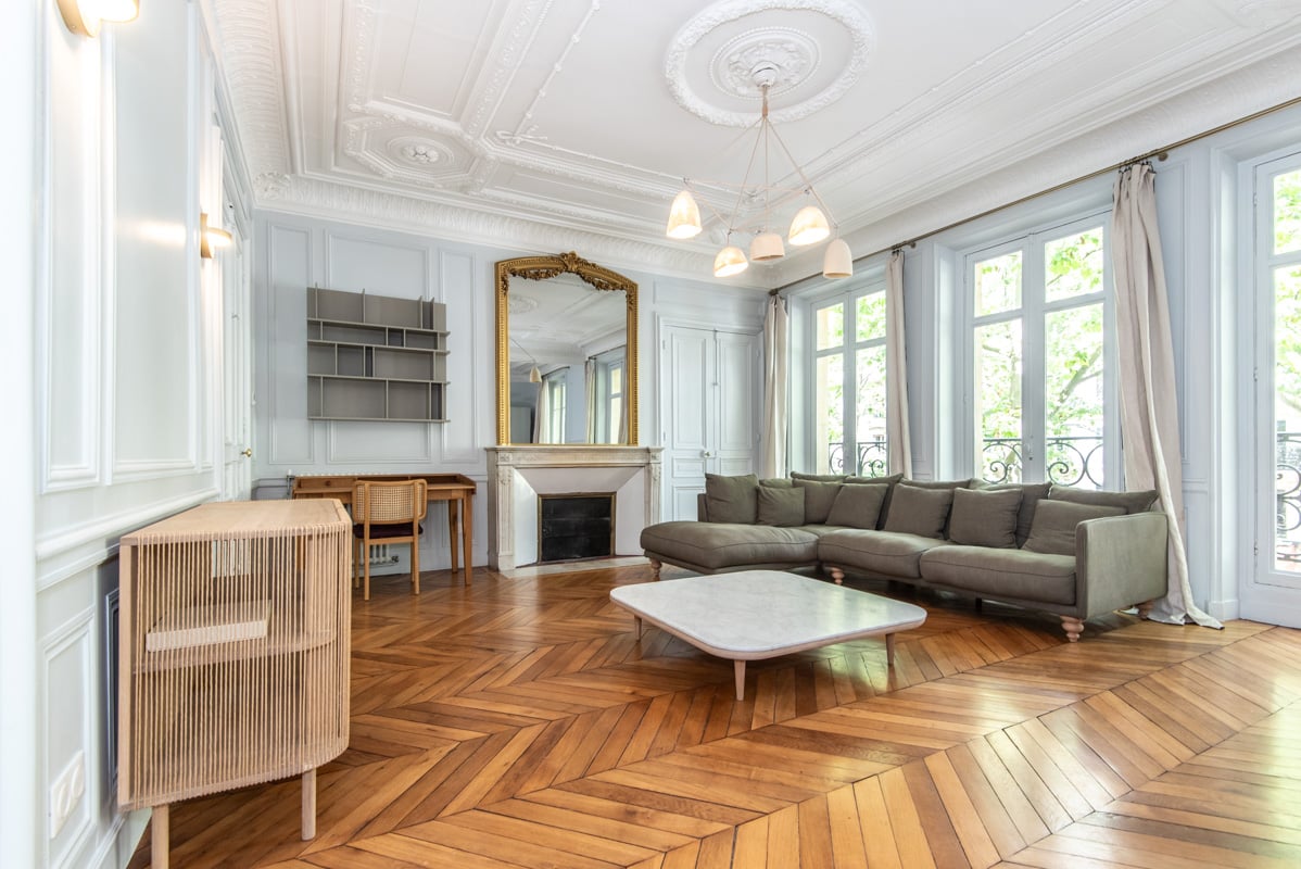 Dans un immeuble haussmannien. Mobilier haut de gamme, décoration raffinée, élégante. Parquet, moulures, cheminée. Belle hauteur sous-plafond.