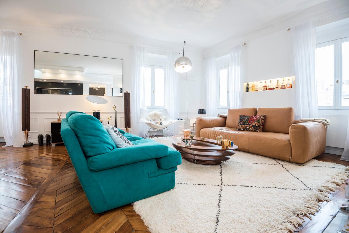 • Un double séjour de 51m² avec cuisine équipée ouverte sur celui-ci. Vue sur la Place Victor Hugo. Au calme (double vitrage) et avec un pan orienté plein ouest.
