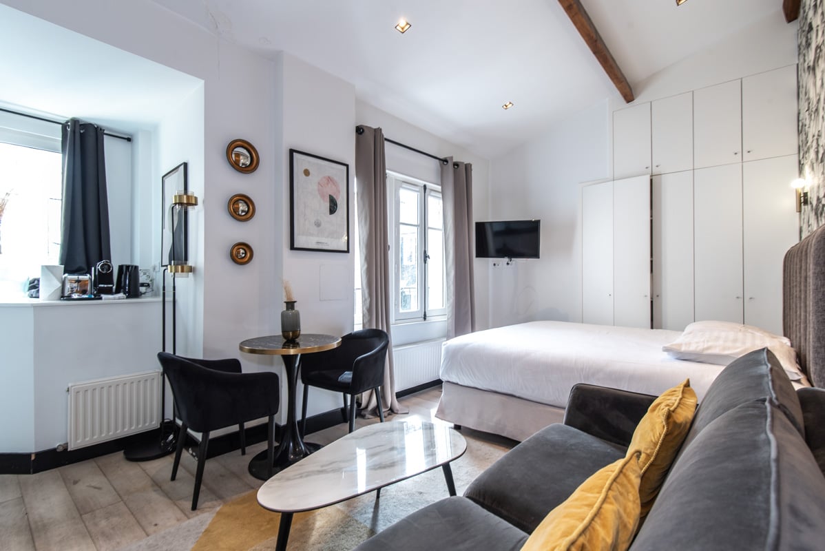 - Une pièces à vivre avec un lit double et un canapé, ainsi que des rangements.