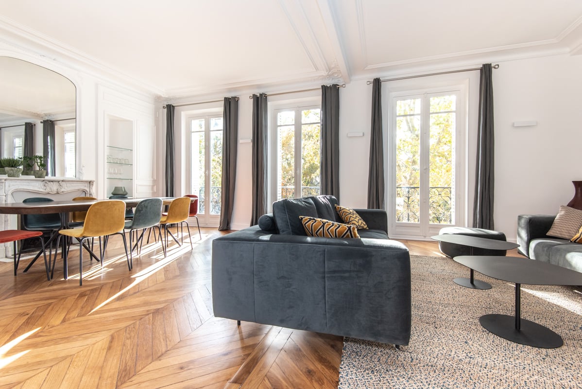 - Un grand double séjour avec 3 porte fenêtres ouvrant sur un grand balcon. Vue dégagée sur les jardins du Luxembourg.