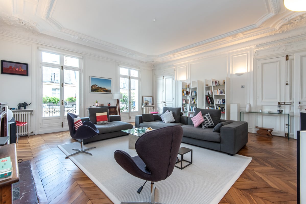 - un grand séjour très lumineux, grandes porte-fenêtres (double vitrage) avec accès balcon filant. Exposé sud ouest. Vue sur le parc Monceau