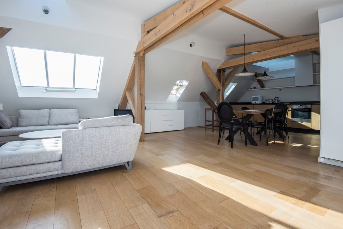 Il se caractérise par sa décoration contemporaine qui, combiné à un joli parquet, participe à créer une vraie atmosphère design. La belle hauteur sous-plafond ainsi que la structure et les poutres en bois apparentes ajoute du charme à cet appartement.