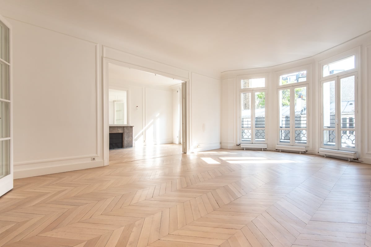 - Un double séjour d'environ 60m², 3,28m sous plafond, offrant un volume superbe. avec grandes porte-fenêtres et bow window. Orienté Est, et dépassant l'immeuble d'en face, l'ensoleillement y est avantageux en matinée. Pour un espace de réception plus spacieux encore, la pièce de 33m² attenante à la cuisine peut être utilisée comme salon (au calme, sur cour).