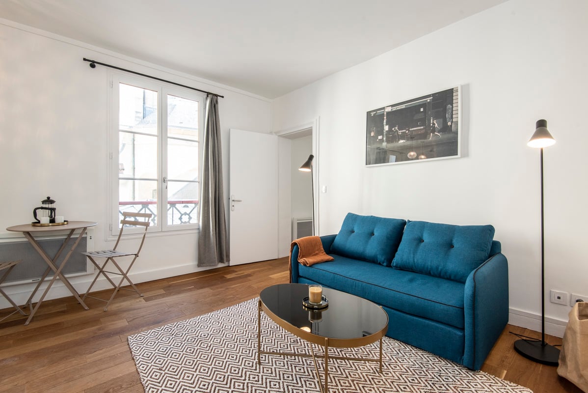 - D’un séjour avec vue sur l’Eglise Protestante « Temple du marais ». Le canapé est convertible.