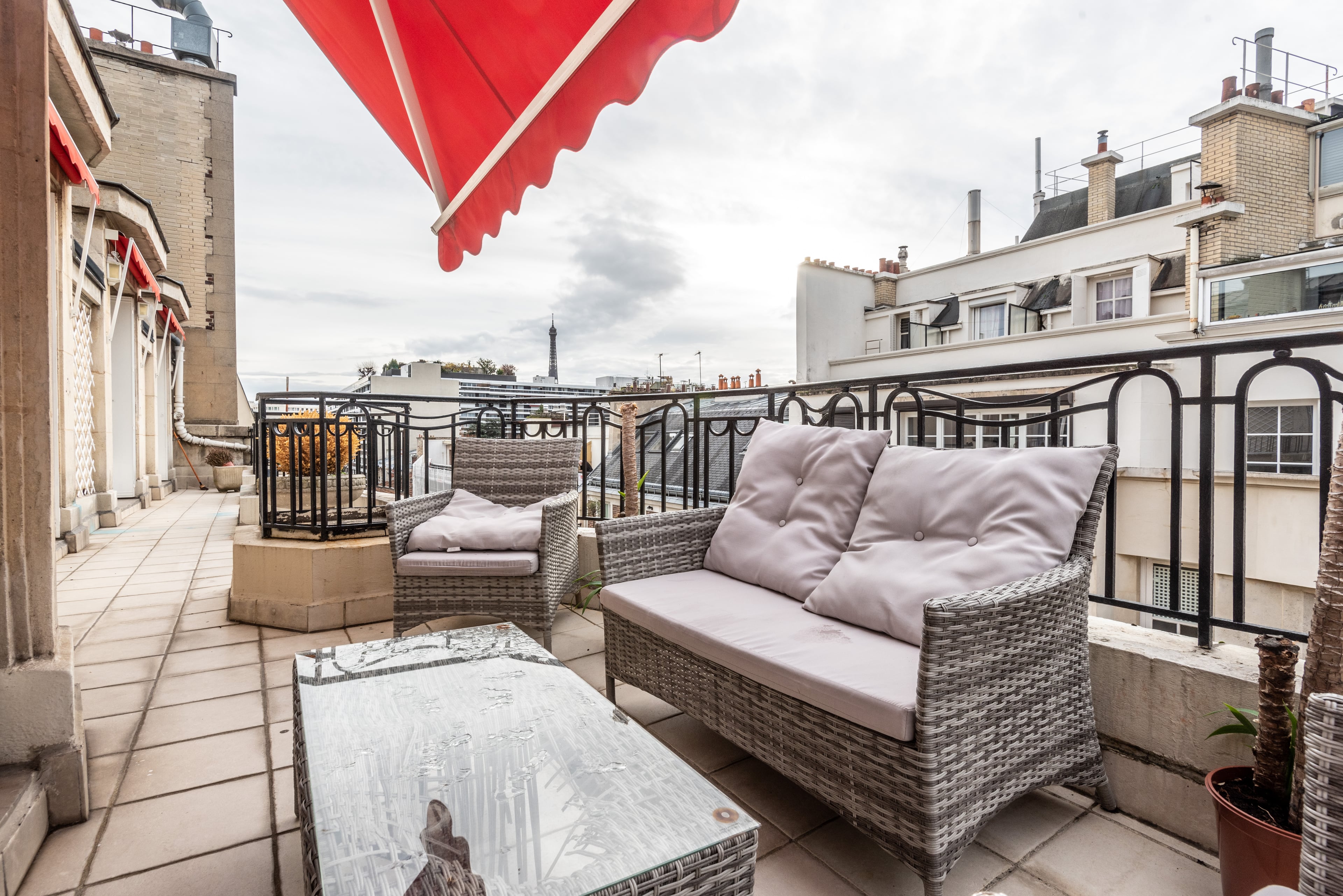 • Un double-séjour avec une très belle hauteur sous-plafond. Accès à une terrasse d’environ 15m² avec une vue Tour Eiffel. Exposée Sud / Sud-Ouest.
