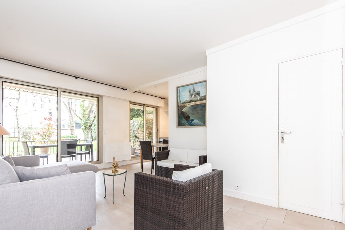 En rez-de-jardin, un appartement meublé situé rue Soyer à Neuilly. A 7 minutes à pied de la station Pont de Neuilly (ligne 1).
