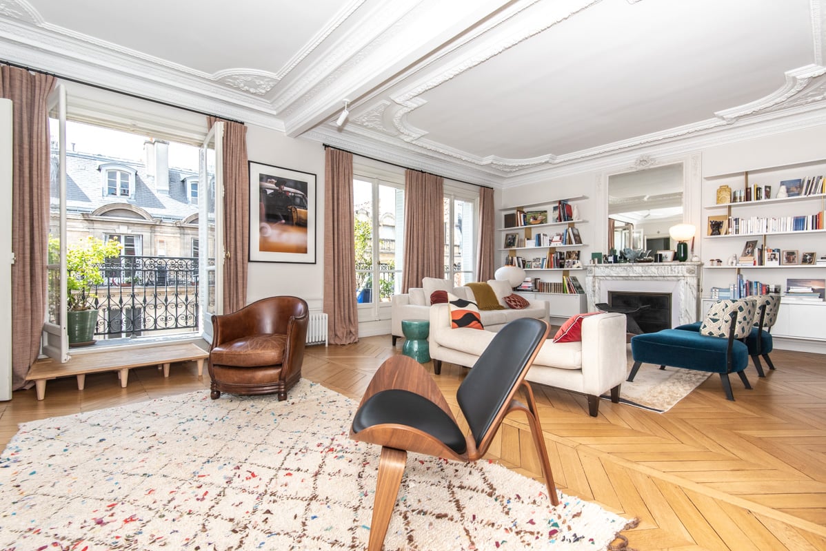 - Un double séjour avec parquet pointe de Hongrie, moulures, cheminée, belle hauteur sous-plafond, 3 grandes porte-fenêtres, accès direct à un balcon filant de 9m², exposé Sud Ouest.