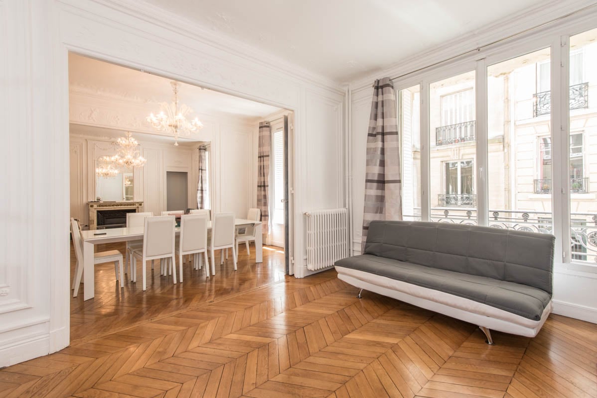 Appartement typiquement parisien avec parquets, moulures et cheminées. Entièrement rénové. Mobilier contemporain.