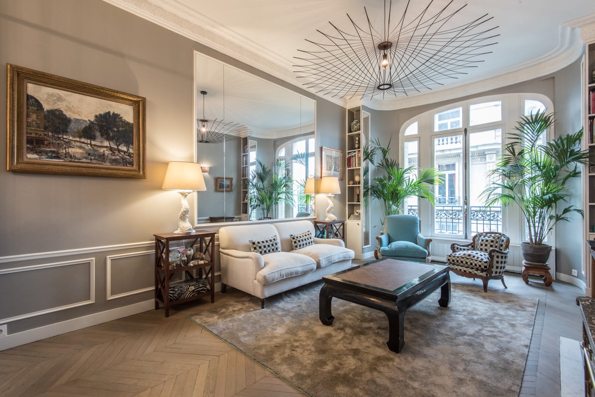 - A living room with classical, hausmannian items (fireplace, heigh ceiling, hardwood flooring).