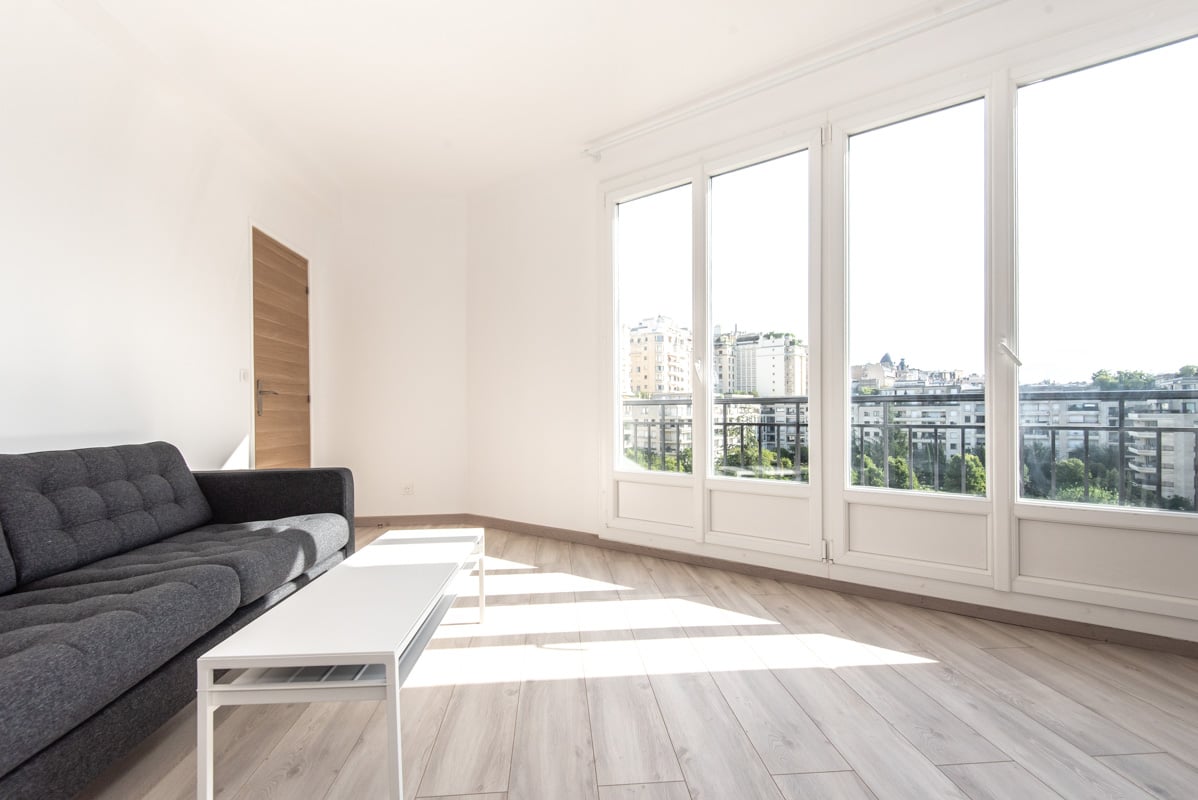 - A living room with large bay windows, unobstructed view, quiet and bright. Opening on a walk-on balcony.