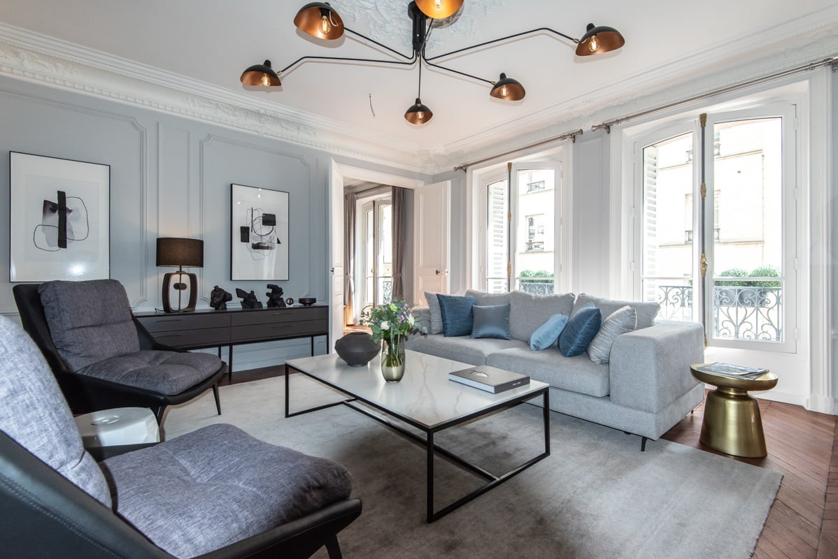 - A living room overlooking rue Lamartine, large French windows redone in wood, double glazed. High ceilings, elegant furniture, parquet hardwoods in excellent condition. The building opposite rue Lamartine is low, which allows the living room to receive light. Southern exposure.