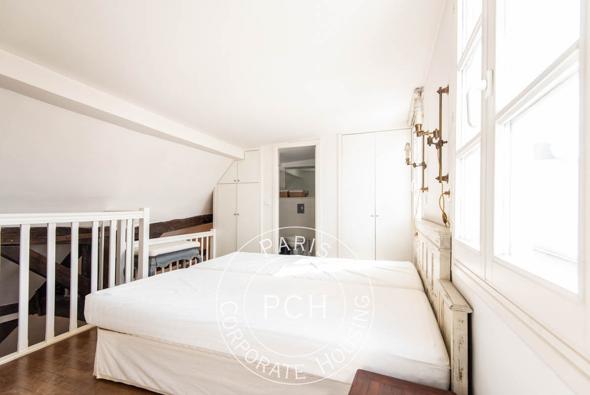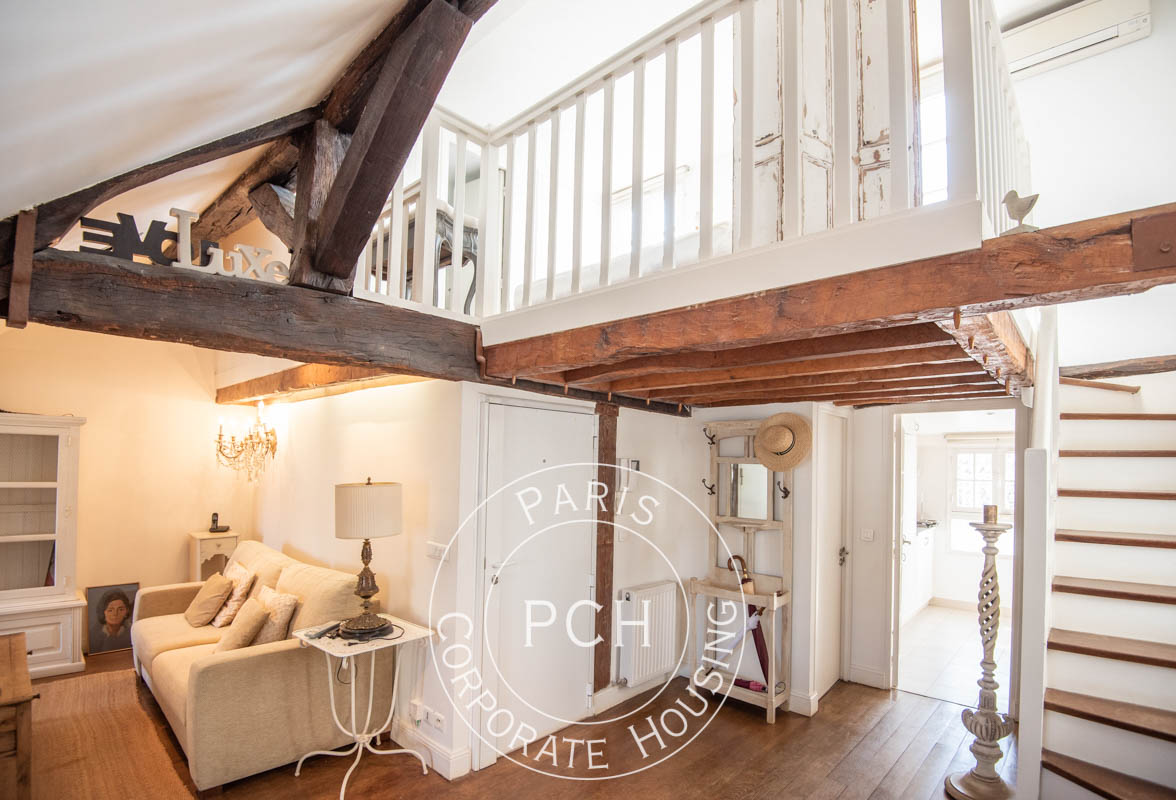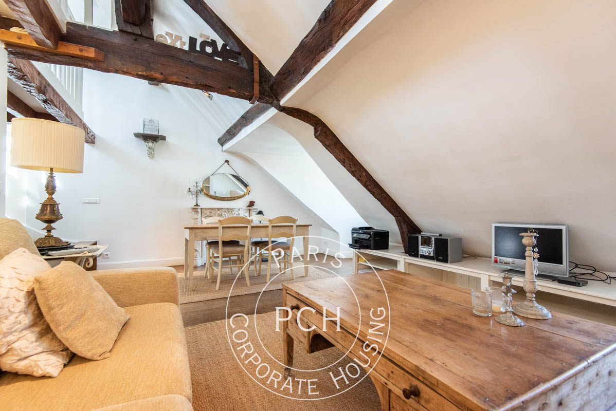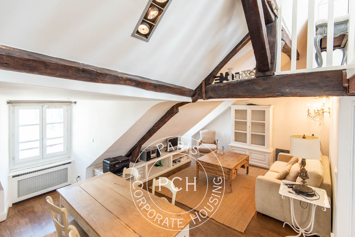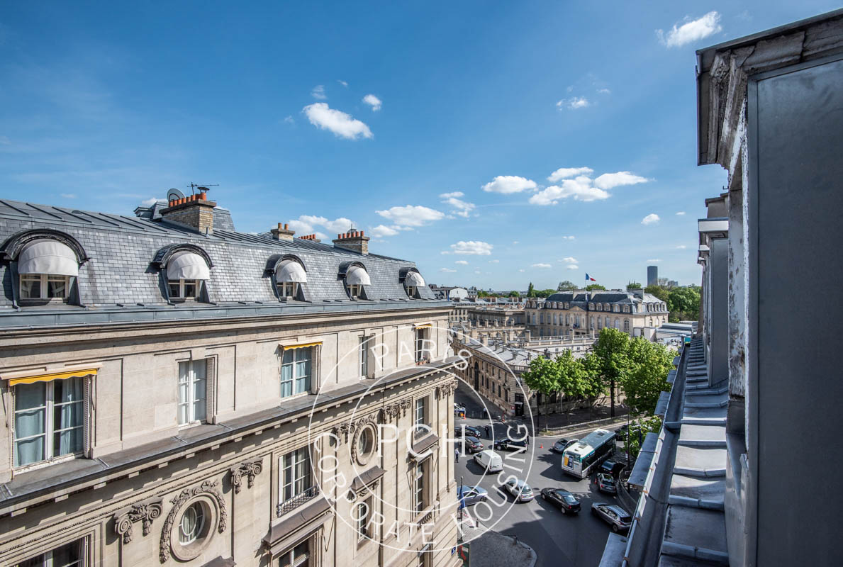 This 43 sqm (53 sqm floorspace) duplex, which is on the 6th and 7th French floor offers a nice view over the courtyard of the Elysée Palace and features: