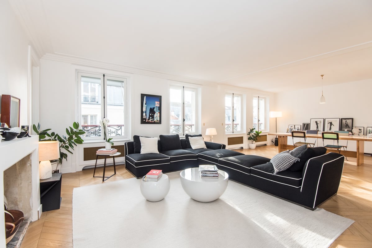 - Un grand séjour avec 4 fenêtres donnant sur la rue de Varenne d'une surface de 50m², exposé plein sud.